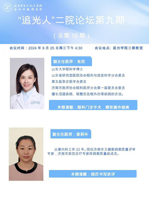 )举办第九期“追光人”大讲堂。本次大讲堂邀请到了眼一科副主任医师张欣与内科副主任医师姜莉华担任主讲嘉宾,他们的精彩讲授吸引了全院眼科医师、技师踊跃参与。