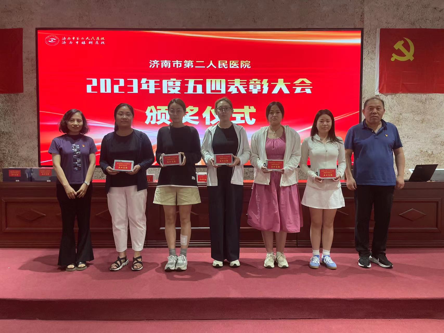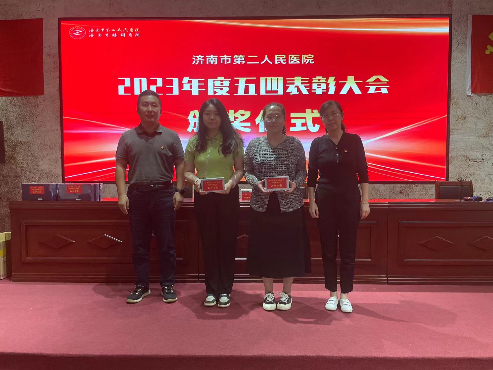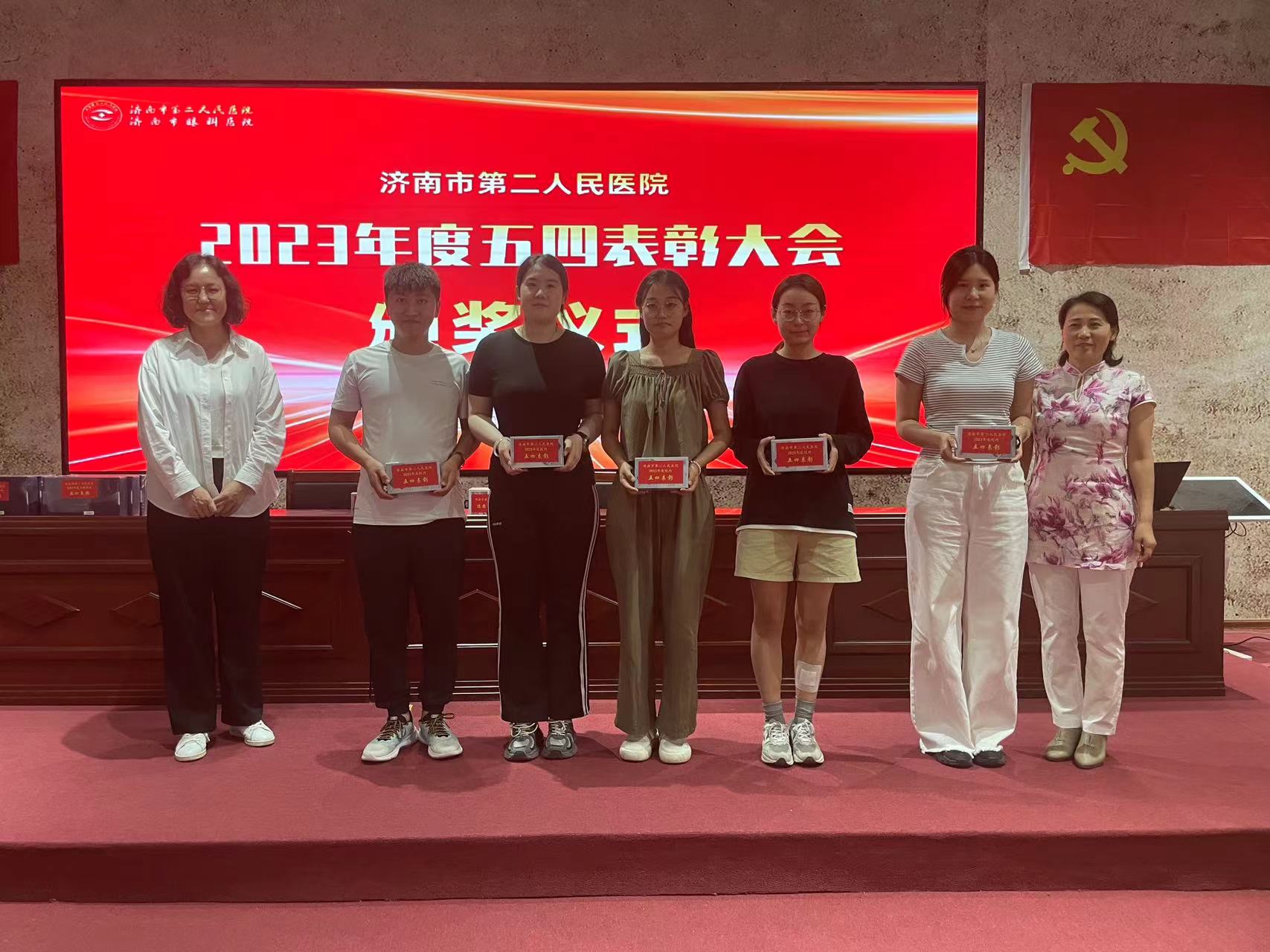 市二院党委书记东光国、专职党委副书记曹传洲、纪委书记刘伟、各党支部书记、第一书记及相关科室主任为获得五四系列表彰的青年颁奖,并向离团团员赠送纪念品。
