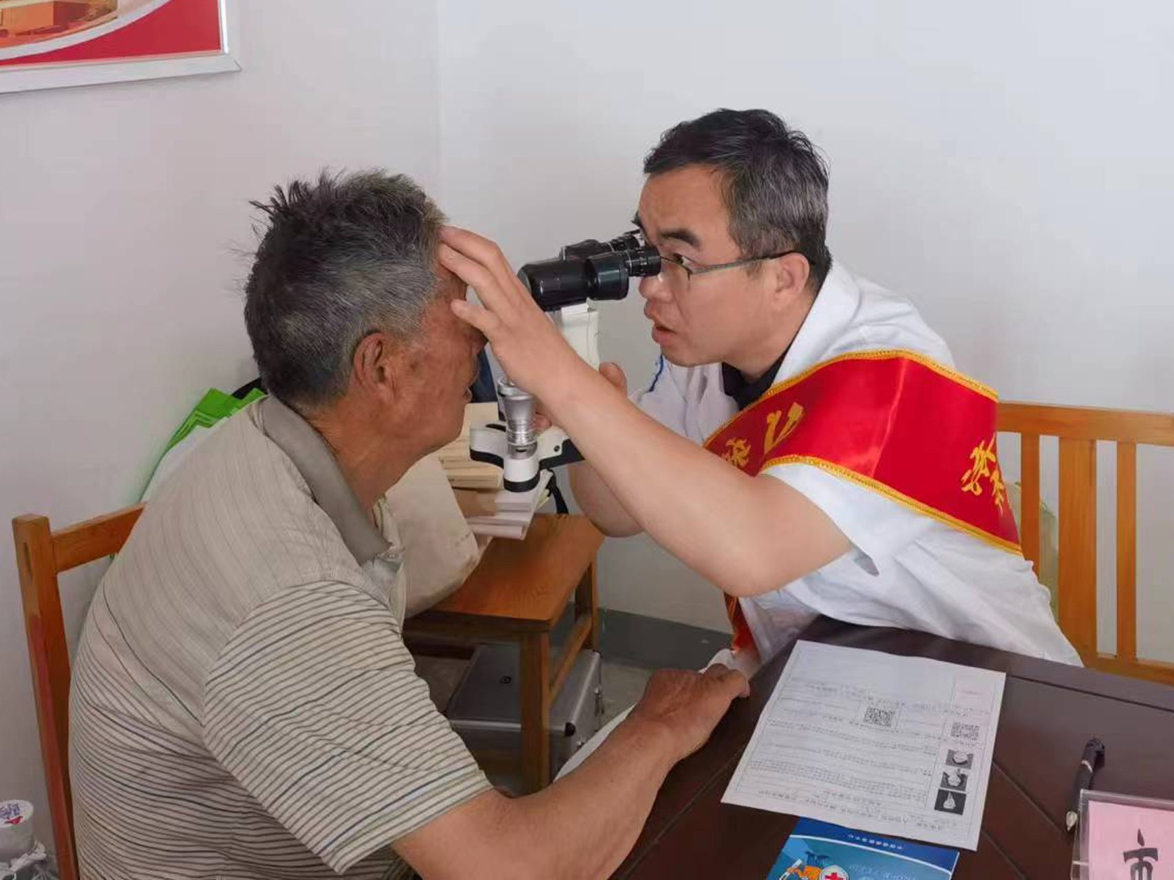 志愿者用裂隙灯为村民检查眼睛