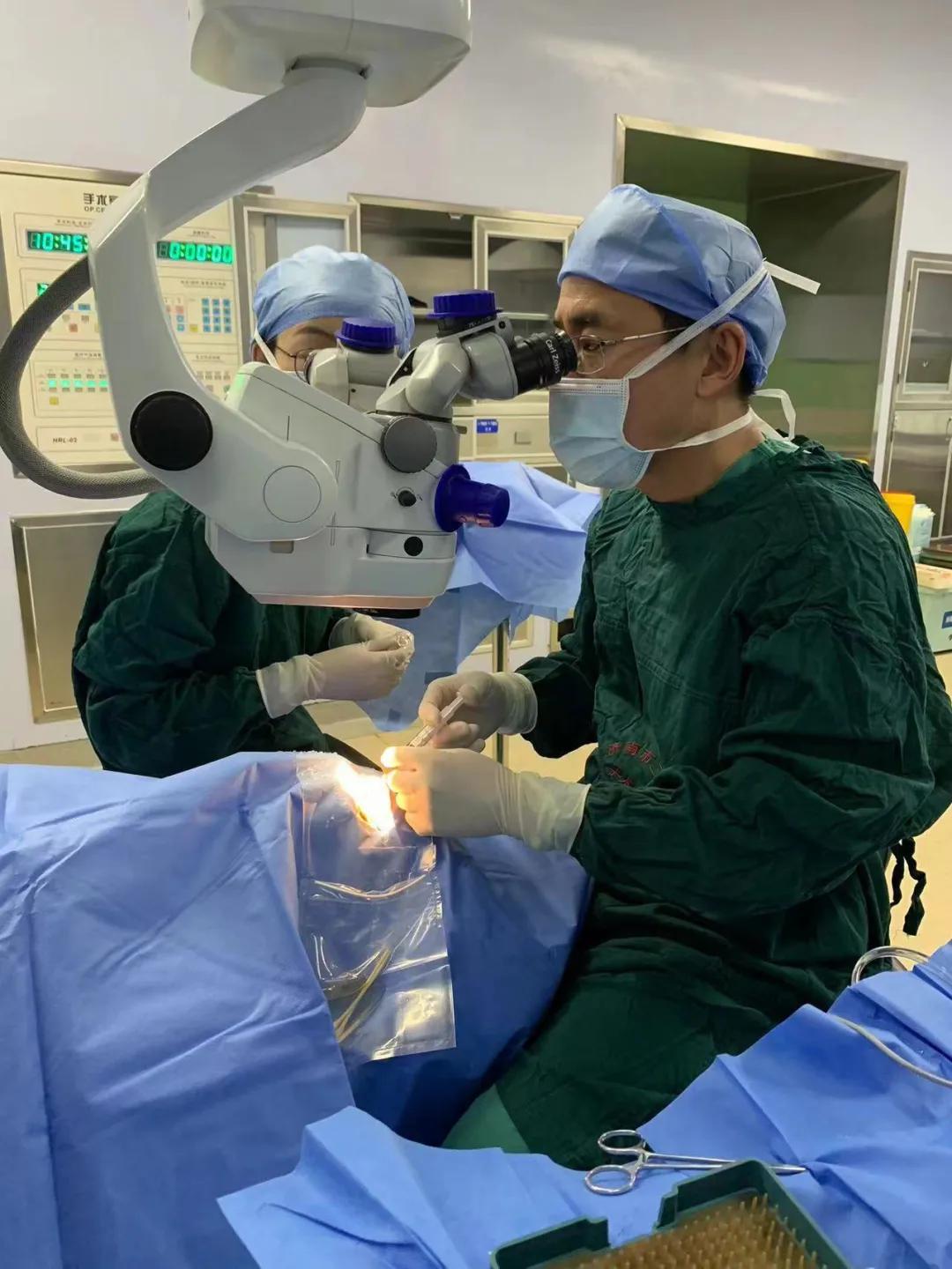为了最大程度降低患者并发症发生的风险,李彬主任带领手术团队采取多次测量、多人校对的方法,力求将测量误差降到最低。考虑到患者精神紧张,容易爆发性出血,决定采用全麻以确保手术安全。虽然压力巨大,但李彬主任与团队默契配合,凭借高超的手术技术及丰富的临床经验,完成了超声乳化抽吸和人工晶状体植入术,手术圆满成功