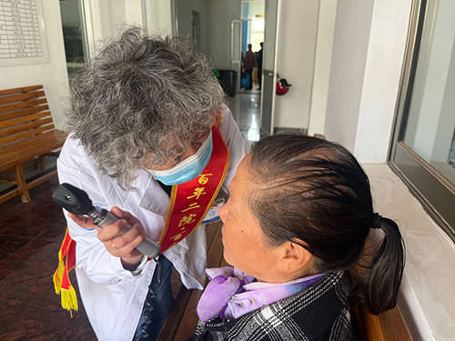 活动开始前,义诊地点早已挤满了前来问诊的群众。老专家们顾不得歇息,便带领志愿者为每一位村民进行视力、眼表、眼压及眼底等一系列检查,并耐心细致地为他们答疑解惑,就群众普遍关心的常见眼病的用药治疗以及日常保健等方面给予了详细指导。老专家们一对一地贴心服务,让村民们倍感温暖。此外,志愿者还向现场群众开展眼健康科普宣传,发放相关资料共计100余份,引导他们学习眼病的预防及应对措施,帮助他们增强健康保健意识。