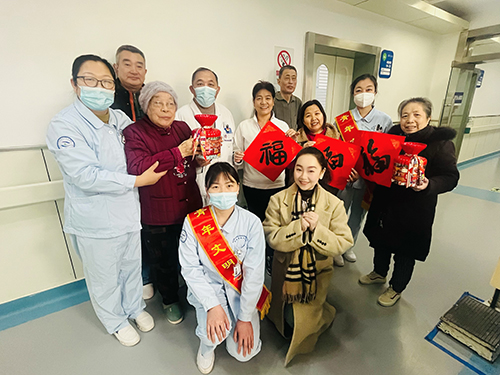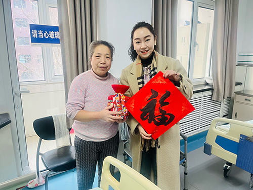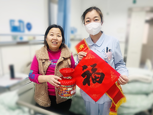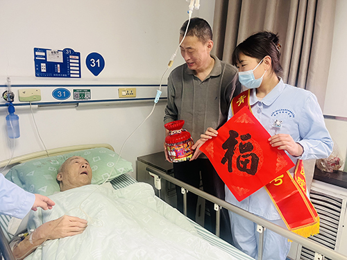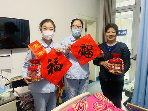 走进病房,春联、灯笼、彩灯跃入眼帘,病房内被迎春的喜庆气氛包围,内科主任梁军将青年文明号代表带到患者病榻边,交流着患者的病情和治疗情况,并为他们送上满满一大罐过年糖和新春祝福,希望他们能早日康复。多位患者及家属都表示住院期间得到了良好的救治和照护,纷纷表达了感谢之情,鞠奶奶特意找出漂亮的红棉袄,高高兴兴地和医护人员合影。