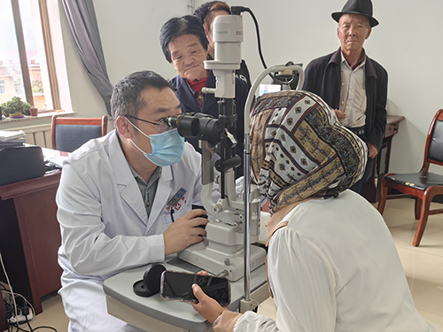 龚斌医师用裂隙灯为患者检查眼睛