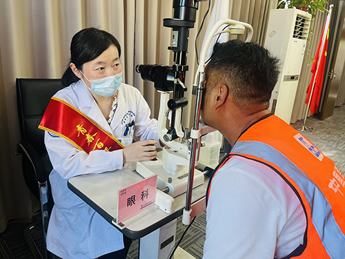 志愿者用裂隙灯为职工检查眼睛