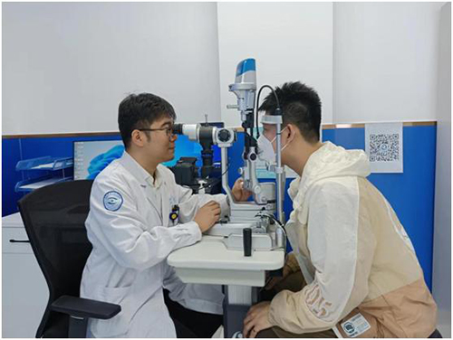 眼外伤科副主任陶远用裂隙灯为居民检查眼睛