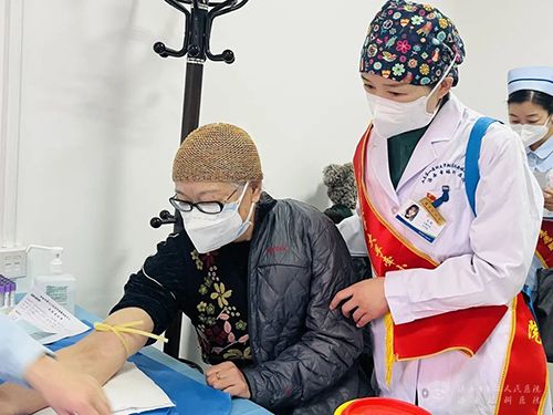 志愿者陪同老党员验血