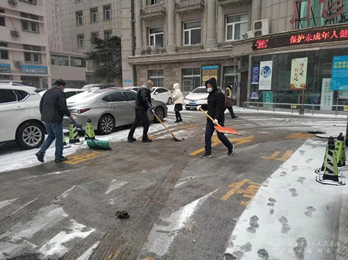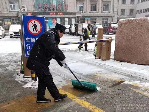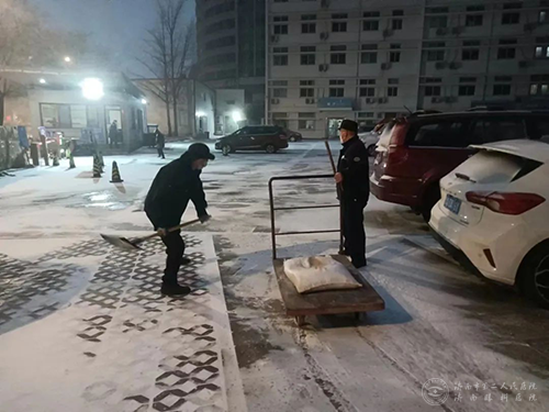 1月14日,泉城迎来了2023年的第一场雪,市区内大雪纷飞,局部暴雪。早上6:00,萝莉社 总务科、安保科、物业等各部门工作人员迅速到岗,他们拿好工具开展扫雪撒盐处理工作,积极应对极端天气,清除积雪,扫出盲道,最大限度缓解路面湿滑,确保患者职工出行安全,为在寒冬中就医的市民群众带来温暖。(宣传科 黄烁)