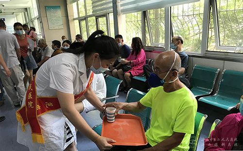 在门诊大厅,党员志愿者一早就位,为患者们送上一杯杯解暑的绿豆汤,并协助开展秩序维护、办卡充值、答疑释惑、就诊引导、科普宣教、核酸采样现场服务等工作,方便了患者就医,提升了门诊运行效率。