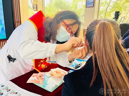 讲座后义诊活动准时开始,志愿者们热情地接待前来检查的职工,现场还有很多游客参与到义诊活动中,志愿者们为园区职工和游客们免费提供内科检查、外科检查、视力检查、裂隙灯检查、眼底检查、中医脉诊、核桃灸体验等项目。