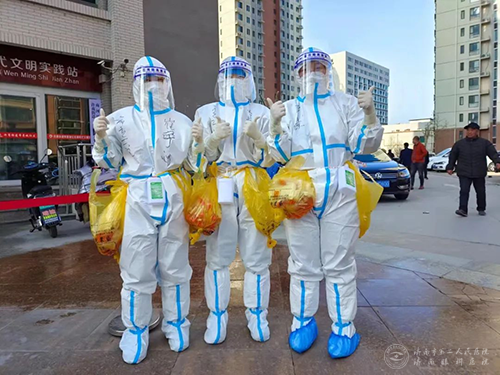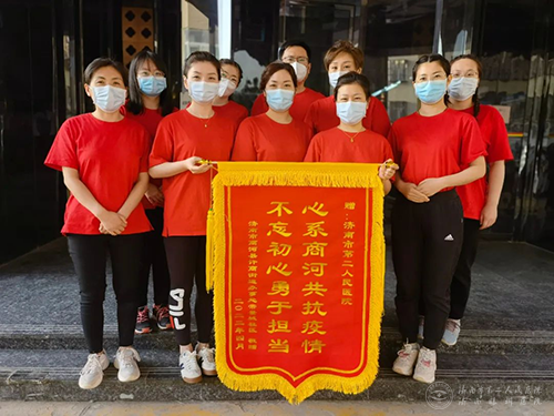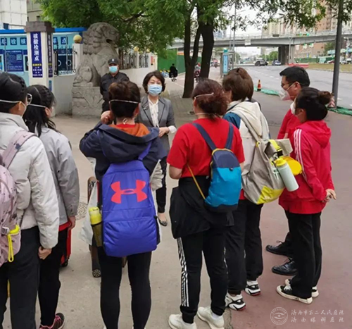 支援商河核酸检测队在顺利完成任务并结束隔离期后返回医院。院党委书记吕丽萍、副院长曹传洲、副院长王旭看望全体队员。