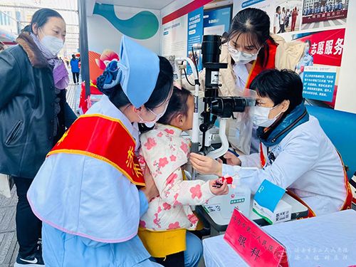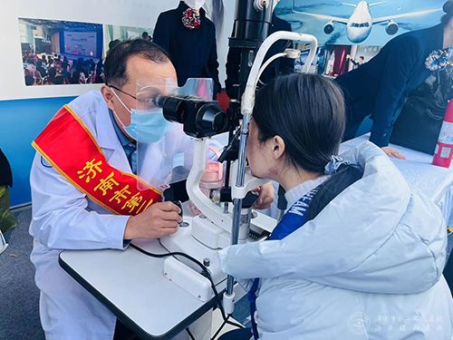 志愿者用裂隙灯为市民检查眼睛