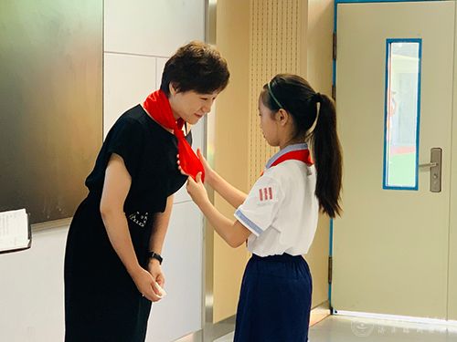 济南师范学校附属小学的学生代表为李林峻佩戴红领巾