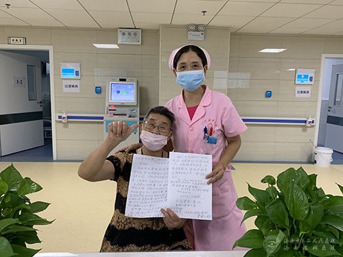 “患者彭继风,失明多年,畏惧手术!经张晨明主任开导和鼓励,上周三顺利完成手术!今天复查,康复良好!患者及家属非常满意,今天下午专门来科室送上感谢信。”这是湘西州民族中医院中层群中的一段对话内容,感谢信是这样写的“我老伴到贵院眼睛开刀,你们邀请的外地专家医术高明,出院后从生活起居,到饮食及吃药的细节等都详细说明交待,技术高超、服务态度好说明对湘西人民有责任感啊!”一封手写的感谢信,饱含着患者的认可和感激。