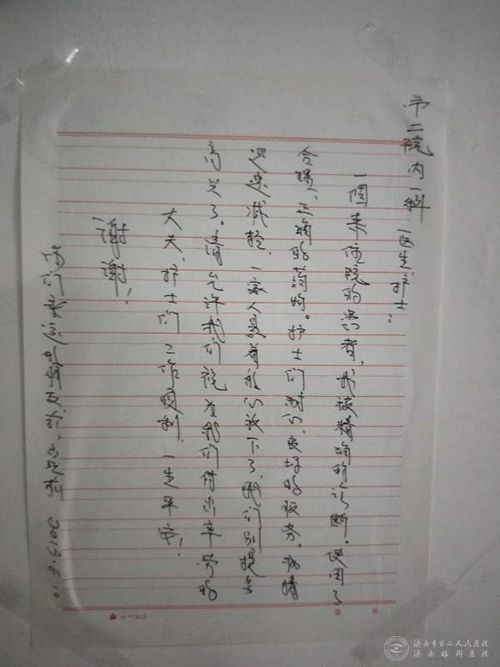 周一的早上,内一区病房走廊的墙上出现了一封给全体内一科医护人员的感谢信。信中写到“一家人悬着的心放下了,我们别提多高兴了!”李阿姨终于敞开了自己那一直紧闭的心门,她见到医生就夸,见到护士就笑,还拉着医生的手说:“你们不仅治好了我身上的病,更是治好了我和家人的心病!从今往后,我只相信家人和你们,老老实实接受正规治疗,我有信心不借助灵丹妙药也能长命百岁!”