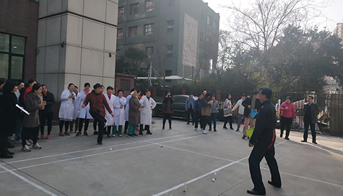 男女搭配,干活不累的“趣味接绣球”比赛开始啦!只见,踢球人“嗖”的踢出毽球,背篓的朝着球落的地方跑来跑去,尤其是很多男同胞也加入了比赛,让现场更加热闹起来,欢呼声、掌声、笑声连成一片,就像欢乐的海洋。最热闹的当数“螃蟹背西瓜”,4名队员同时站于起跑线后,双手交叉放在胸前,用背部共同夹住瑜伽球,齐心协力将球运到终点。哨声一响,4名队员立刻背对背站好,为防止瑜伽球掉落,正如比赛项目的名称一般,4名队员像螃蟹般横行而过,整个过程最是考验团队的默契,选手们半点都不敢分心,大家风格迥异的表现,引得观众哈哈大笑。一下午的时间,二院的院区内春意正浓、趣味横生。
