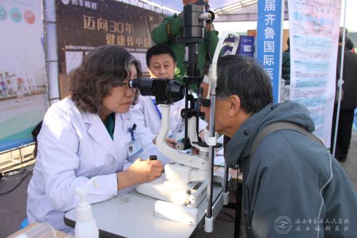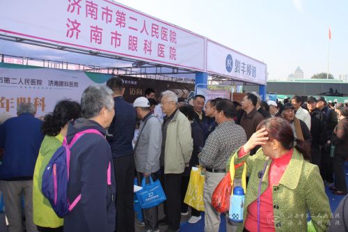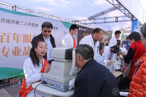 展位前等候免费检查。“有4年多了,左眼总是流泪,遇到强光和风,眼泪更会流出,也到医院做过检查,但一直不见好转。”不久前刚荣获“山东省优秀医师” 的市二院王建荣主任告诉他,经过初步检查,他的双眼有轻微白内障,左眼有翼状胬肉,建议他进行翼状胬肉切除手术。知道了自己的病因后,王兴权老人很高兴,一个劲地说谢谢。“这个活动好,希望你们以后经常搞这样的活动,来给我们看病。”因为排队等待做眼科检查的市民非常多,医生们提前半小时就开始为市民免费做检查,忙得连水都没顾得喝。市二院内科志愿团队也来到义诊现场,为百姓测量血压,检查问诊,志愿者们还为市民发放了视力表和眼科科普宣传材料。