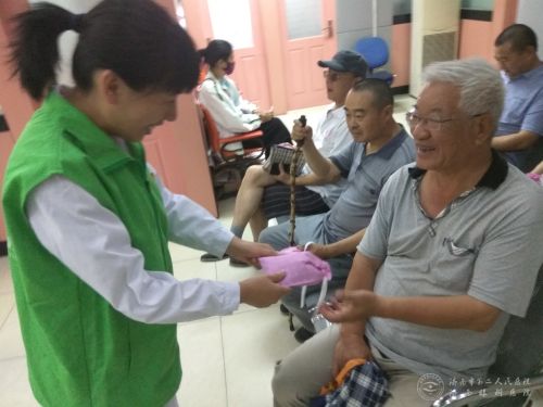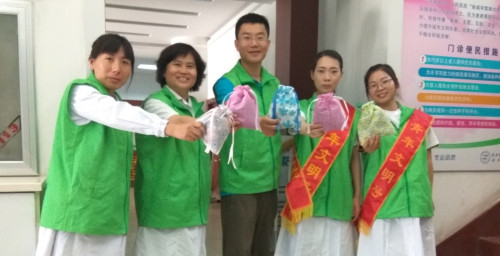 志愿者为候诊群众送上驱蚊香包