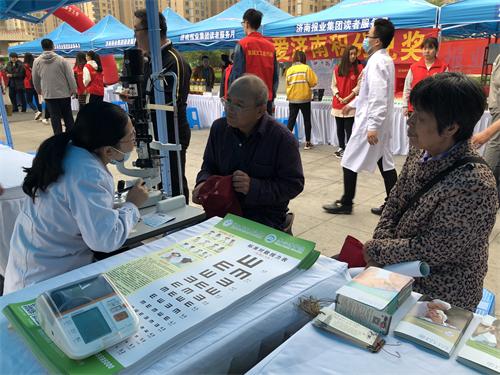 义诊现场,来自济南市二院的眼科专家认真为每一位市民答疑解惑,并利用裂隙灯进行专业的眼部检查。与此同时,志愿者还现场发放了眼科科普宣传册、视力表和精美书签。三个小时的活动现场气氛十分活跃,群众对义诊活动的反响也都赞不绝口。