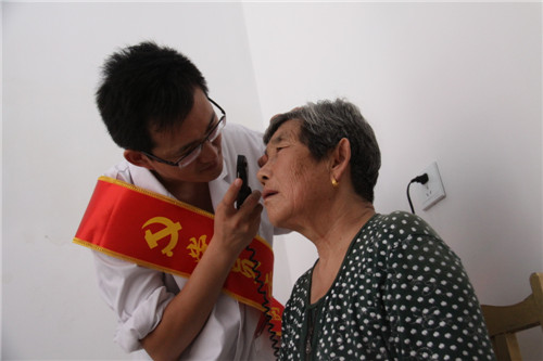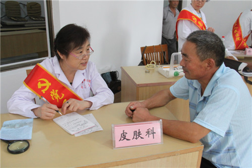 此次健康扶贫活动主要以义诊和健康宣教为主,专家团队由内、外、眼、中医、皮肤等专业骨干组成,专家们利用所携带的检查设备为村民进行了细致检查,并根据检查结果提出治疗建议,免费发放了常用的家庭药品。义诊活动还吸引了里石村和石匣村的很多村民,临时布置的诊室里挤满了前来求诊的群众。8月的天气格外闷热,临时诊室里通风不是很好,汗水渐渐浸透了专家们的衣服,但他们顾不上喝水,全神贯注地投入到诊查工作中,询问病史,了解用药情况,开具诊疗处方,详细解答村民的问题。外科的杜大夫在为某位村民检查身体时,意外发现了村民身上侵入了三只形似黑痣的蜱虫,杜大夫小心翼翼地取下了三只蜱虫,解决了困扰这位村民很久的奇痒……在人群中,身着“党员示范岗”绶带的志愿者们也在辛苦地忙碌着,查视力、发放宣传品、疏导人群,义诊工作井然有序。义诊持续了4个多小时,专家们诊治完最后一名村民已是中午时分,此时的天空下起了小雨,仿佛这一丝清凉也想尽力为大家驱散炎热与疲惫。在回程的路上,内科专家刘主任说道:“这次义诊虽然辛苦,但能为村民提供求医问药的帮助,大家都觉得很值得。这些村民都很朴实,对我们的工作也很感激,他们有的劝我们休息喝水,有的邀请我们到家里吃饭,这些话让我们心里感到很温暖,觉得我们的工作很有价值。”