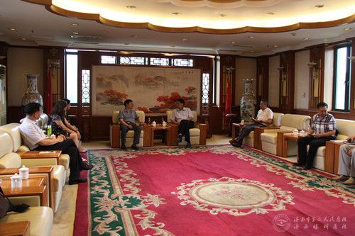 (济南眼科医院)党委书记、院长李金星,副院长吕丽萍一行5人赴泰山医学院商谈合作开办视光学专业相关事宜,泰山医学院党委书记王长松、副院长王鹏程、实践教学部副部长蒋士民、医学信息工程学院院长张兆臣参加了会谈。