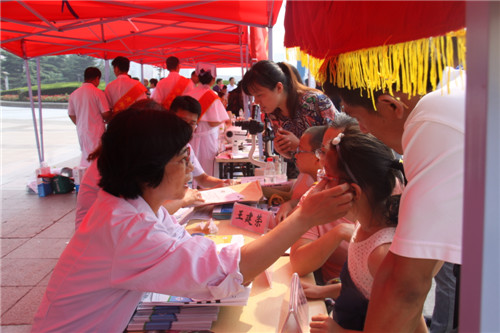 此次市二院委派了包括季强、王建荣、张文等在内的7位知名专家参与义诊,义诊项目包括眼科、内科、妇科等常见病的检查。医院还专门携带了电子视力灯箱、裂隙灯、验光仪、镜片检测仪等多个专业检查设备,为现场的群众进行视力、眼科、内科、妇科等检查。一上午的时间,二院的义诊台前,前来咨询检查的群众络绎不绝。专家们认真为每一位群众检查,详细解答群众咨询的每一个问题,并根据初步检查的结果,赠送了部分眼药水等药品。专家们优质的服务不仅赢得了群众的高度认可,还吸引了济南电视台、齐鲁网等多家媒体前来采访。与此同时,志愿者们还在现场向群众发放了眼科科普宣传册、视力表等资料,并送上医院制作的精致纪念品,积极宣传爱眼知识。活动现场,由二院10名志愿者组成的队伍进行了广播操表演,受到群众好评。医院的多位志愿者还现场献血,用实际行动向全市市民展现了泉城卫计人崇德向善的道德情操和健康向上的精神面貌。义诊活动一直持续到中午才结束,据不完全统计,此次医院共义诊90人次,宣教200人次,发放药品60份,发放宣传材料800份。