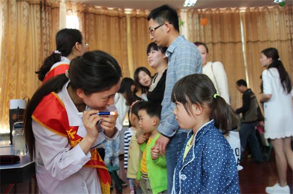 本次活动有120余名学童及家长代表参加,大家早早来到教室等待讲座开始。市二院“眼博士”志愿服务队的青年眼科专家张辉博士担任了本次健康课的主讲人,她通过幻灯片、猜谜语、有奖问答等形式和孩子们进行互动,生动地讲解了眼睛保健常识,课堂气氛十分热烈。在随后的义诊环节中,志愿者们为孩子和老师们进行了眼科专业检查和眼病咨询,并向各班级赠送了视力表,得到了幼儿园师生的欢迎。