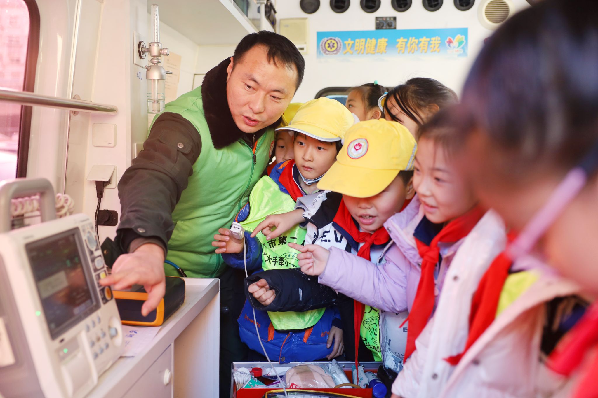 志愿者为小朋友讲解急救车上的仪器