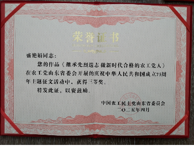 支部主任委员盛艳娟撰写的《坚定中国新型政党制度自信 在新时代新征程中不断传承农工党进步性》一文荣获农工党中央2024年理论研究优秀论文三等奖。此次征文活动中,各省级组织共收到1551篇理论征文,经初审筛选,提交入选论文547篇。经中央研究室组织专家匿名评审和复审,并报中央领导审定,综合评选出理论研究优秀论文奖428篇,其中一等奖66篇、二等奖132篇、三等奖230篇。盛艳娟主任委员在本职工作中精益求精,充分发挥自身专业优势,在参政党理论研究方面取得了丰硕成果,为新时代中国特色社会主义参政党建设贡献了智慧和力量。
