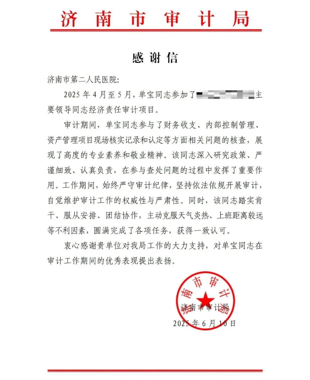 )发来感谢信,对医院大力支持市审计局“以审代训”项目表示感谢。信中提到,医院积极协调派出审计科负责人单宝同志,参与相关单位主要领导同志经济责任审计工作,并对其在审计期间的优秀表现给予高度肯定与表扬。