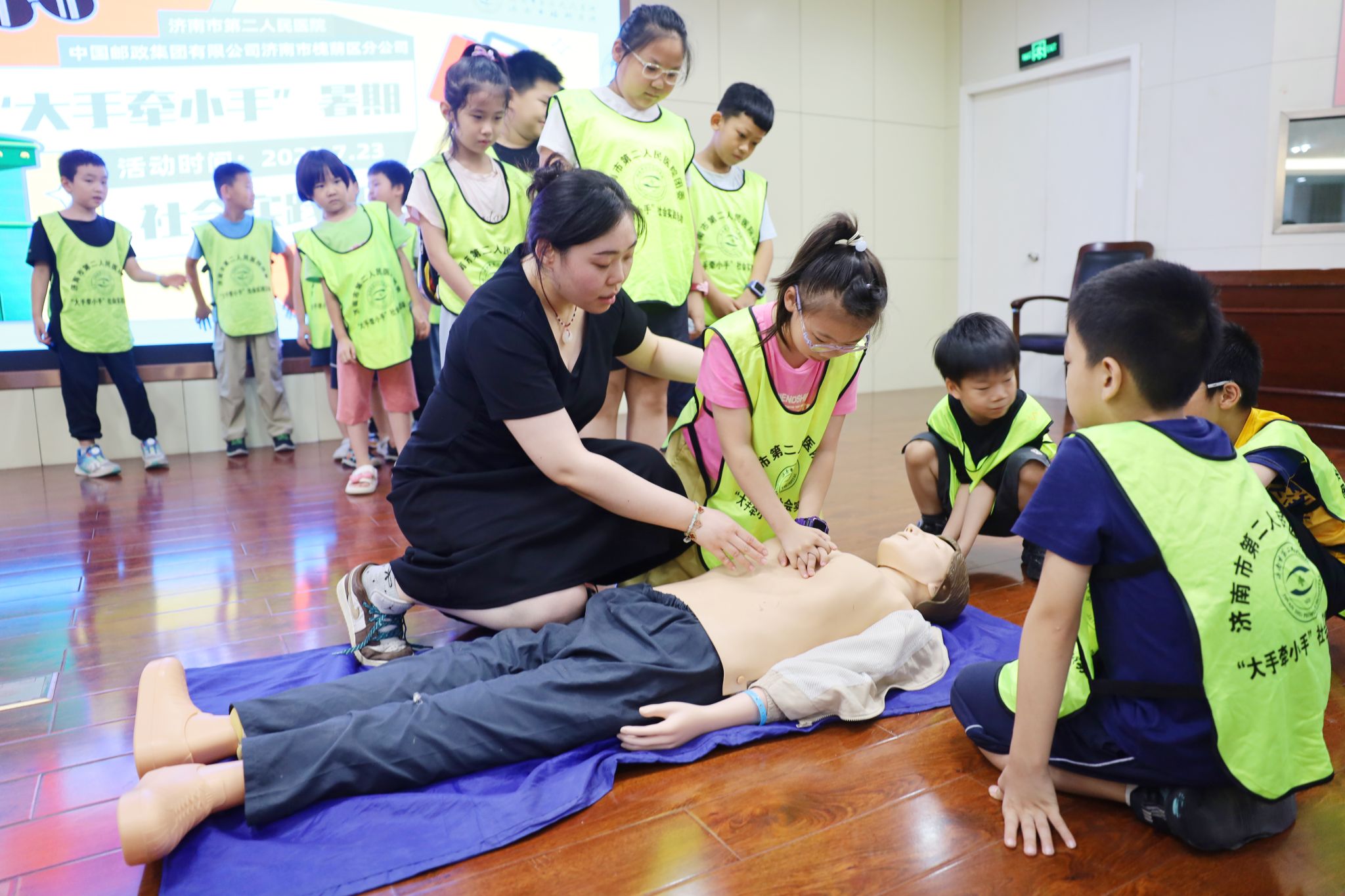 随后,市眼科医院(市二院)的急救知识讲师为孩子们带来了一场生命守护者的急救知识初体验。通过情景模拟与实操演练,志愿者生动地展示了常见意外伤害的识别与处理原则,并重点演示了基础心肺复苏术(CPR)。在志愿者的指导下,孩子们纷纷尝试,认真练习着按压动作。