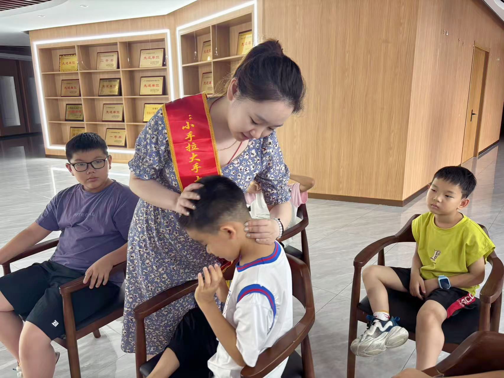 “轻闭双眼,找准穴位……”伴着舒缓的口令,志愿者躬身示范,细致矫正每个孩子略显稚嫩的动作。当有孩子反复揉错穴位时,志愿者耐心牵引小手反复练习:“对,小手指再往下一点点,是不是感觉有点酸胀?这就找对地方了!”这精准指导中的俯身与牵引,恰是“大手牵小手”最温情的注脚。