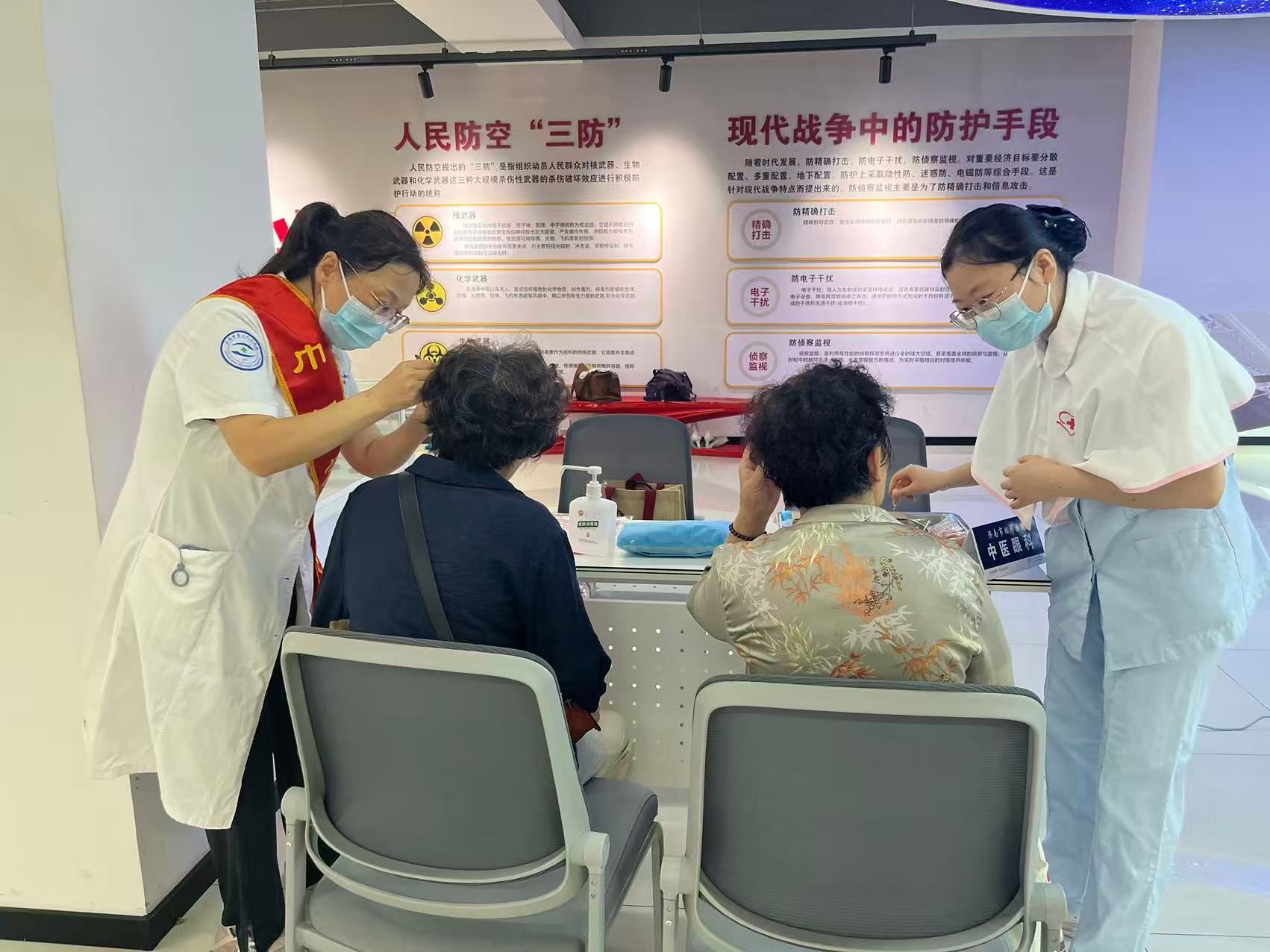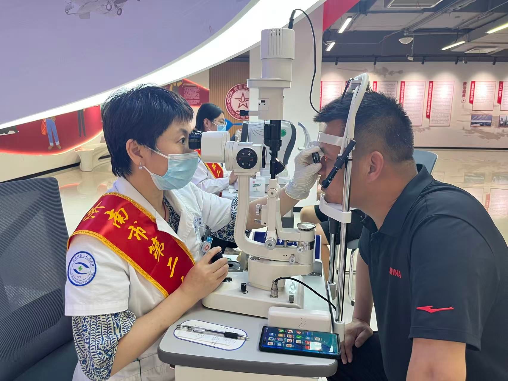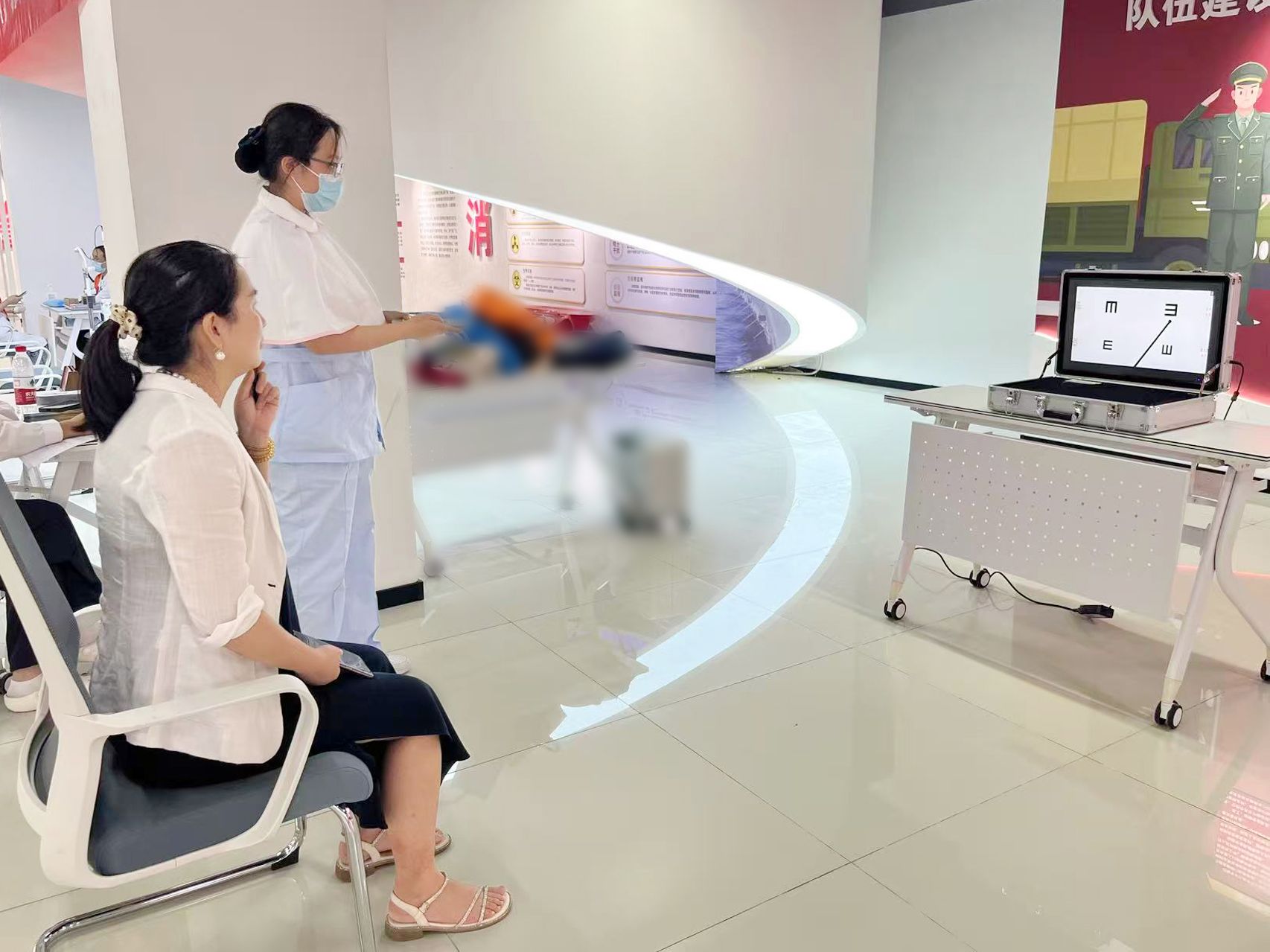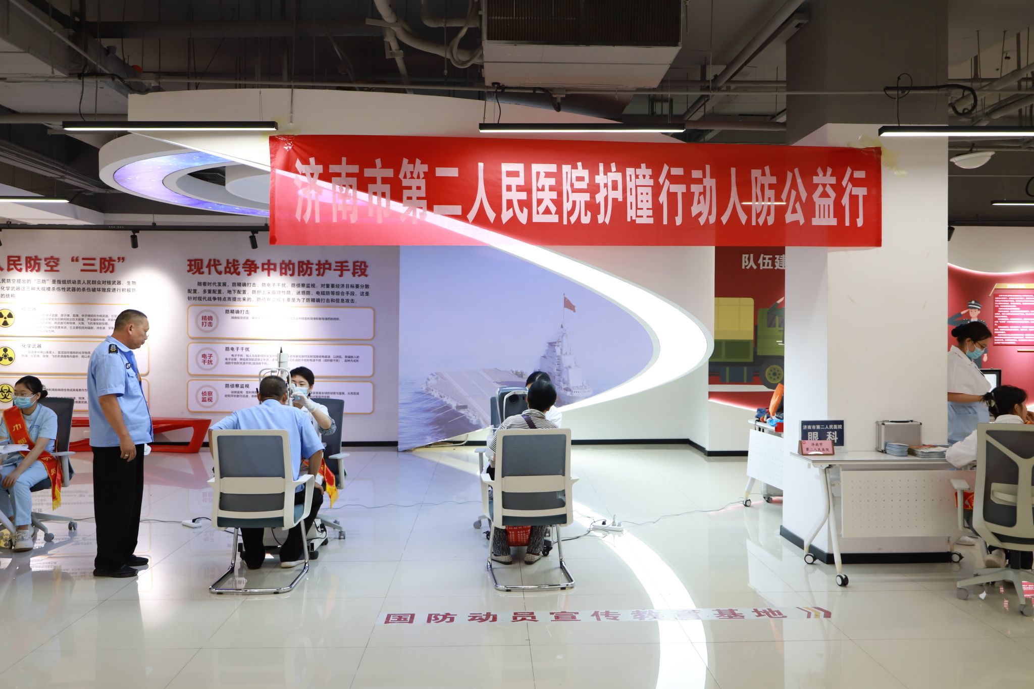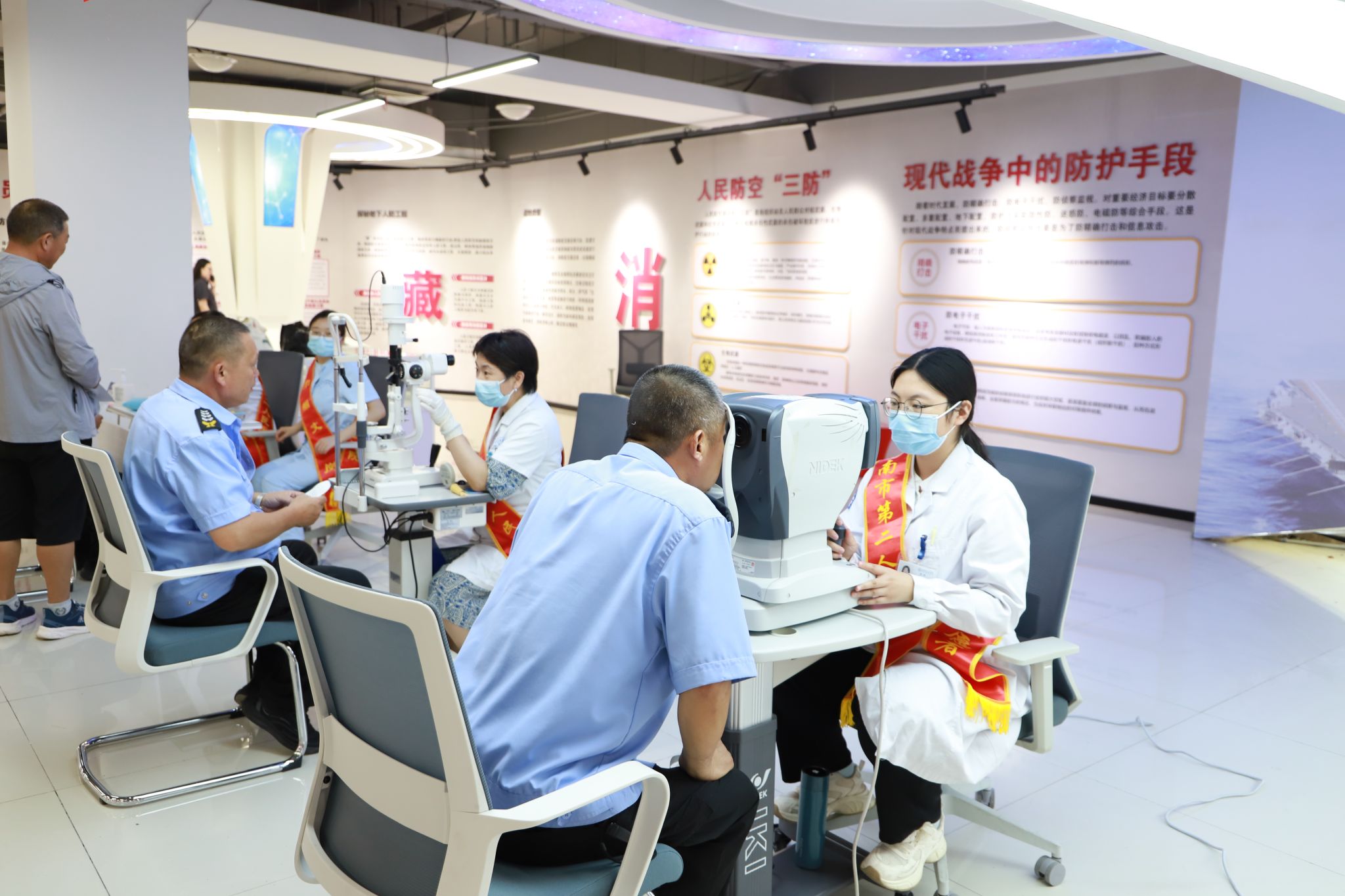 )“护瞳行动”志愿服务队走进槐荫区纬十二路人防工程,为参加“跨界互通,流量共享”——第一届企业家资源融合发展论坛的企业代表,以及“庆祝中国人民抗日战争暨世界反法西斯战争胜利80周年”文艺演出的演职人员提供了专业的眼健康义诊服务。