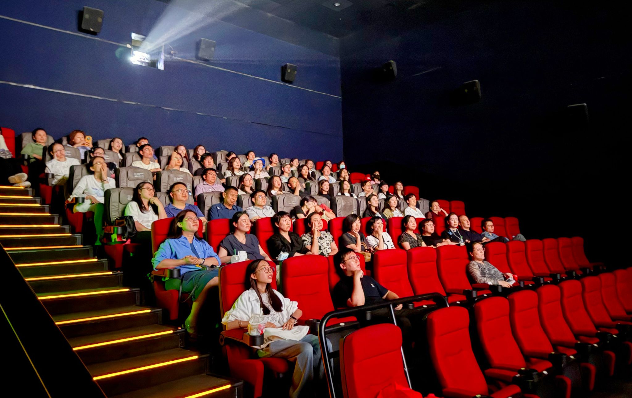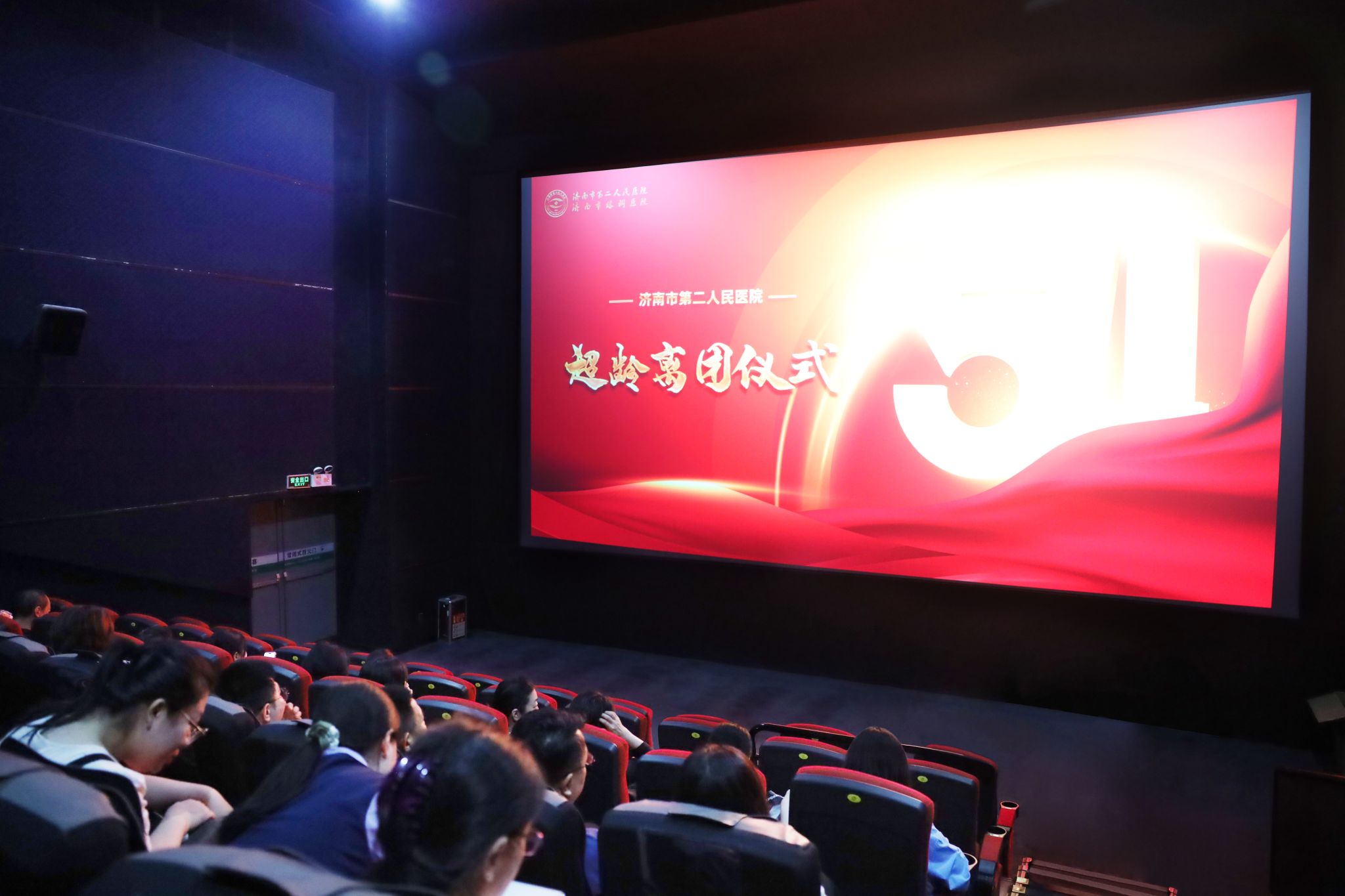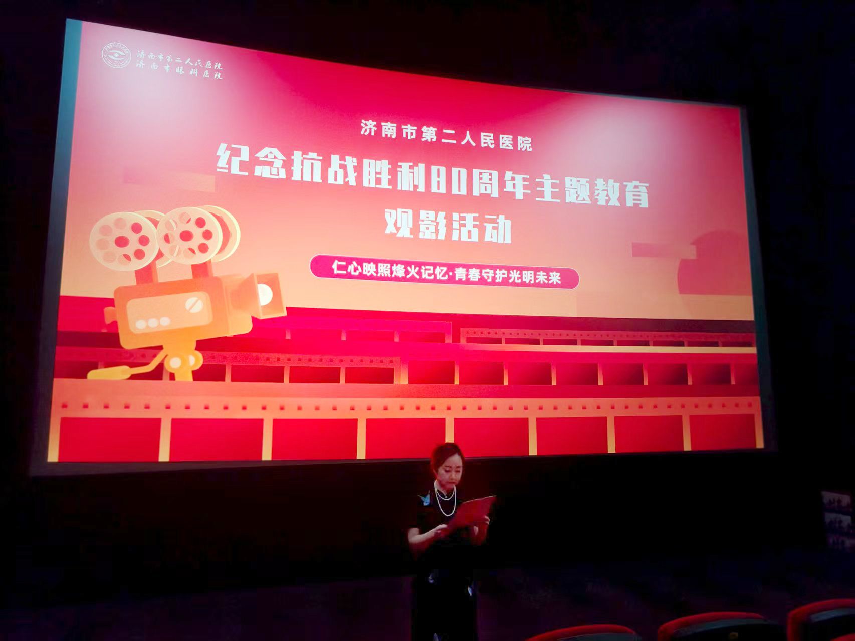 )在经四路万达电影院组织开展“仁心映照烽火记忆•青春守护光明未来”主题教育观影活动。济南市槐荫区五里沟街道发祥巷社区党委书记吕雪芹、医院各党支部委员、青年文明号负责人、团委委员、受表彰青年代表、离团人员及社区工作人员等70余人参加活动。