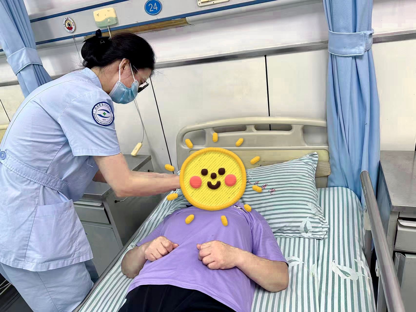 在了解到手术的风险后杨阿姨紧张到夜里翻来覆去睡不着,陌生的病房、即将到来的手术,让她心里打鼓,杨阿姨内心很是焦虑。主管医生刘胜男看出了她的不安,拿着手术方案坐在床边,一边画一边讲:“阿姨您放心,咱们做过好多像您这样的病人,你现在做的就是放宽心,好好配合,这是你的晶体......”;责任护士王园更是像自家闺女一样,帮她铺好被子,陪她聊家里的事,“您外孙这么乖,等您眼睛好了,就能天天看他写作业啦”,王园护士贴心介绍病房环境、陪她聊家常,为杨阿姨打好热水,做好了住院期间的健康宣教,慢慢化解了杨阿姨的紧张与不安。