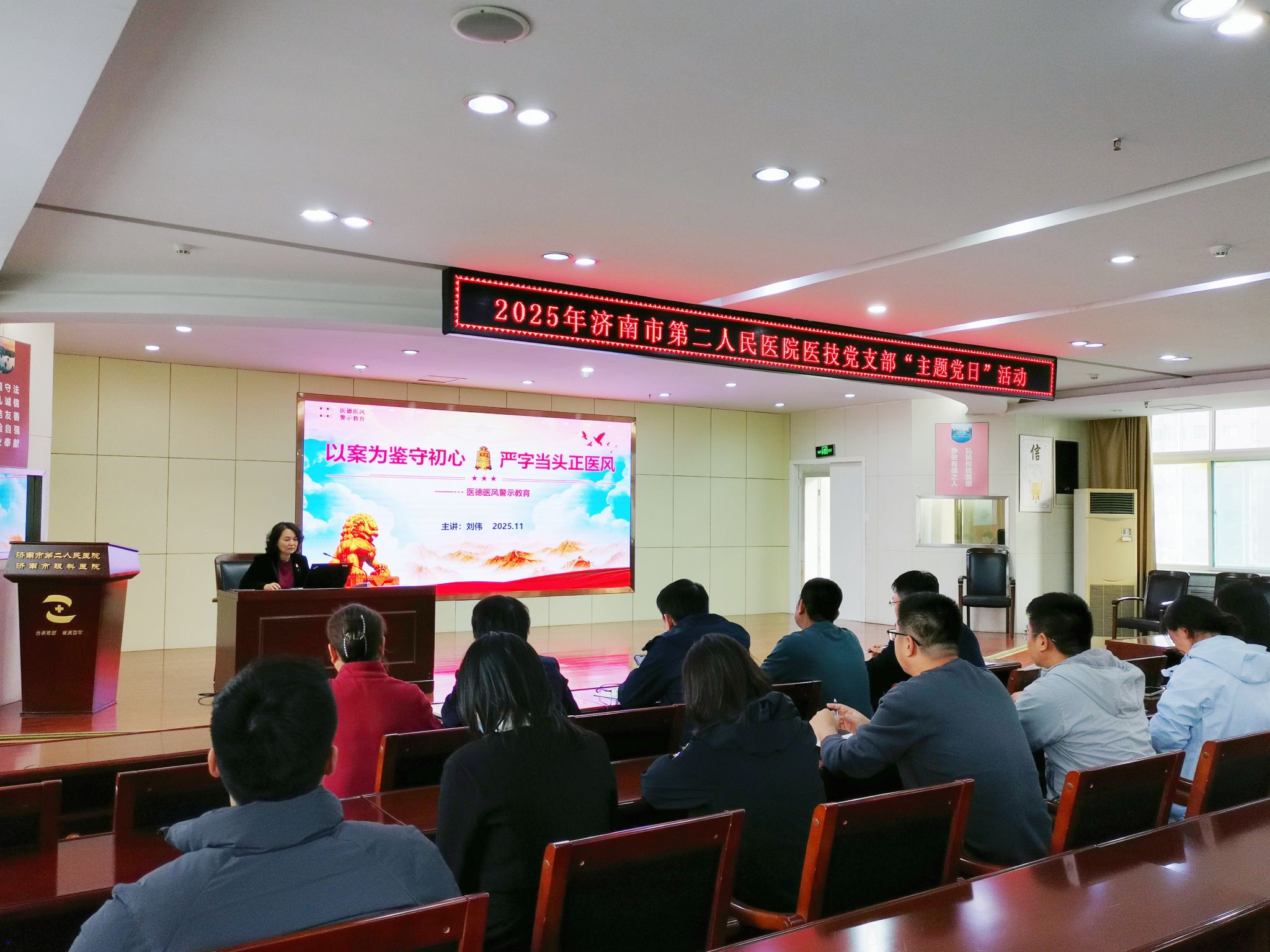 )医技党支部举办专题党课,主题为“医德医风警示教育:以案为鉴守初心,严字当头正医风”,医院纪委书记刘伟担任主讲,通过讲授专题党课进一步强化医务人员职业道德修养,筑牢拒腐防变的思想防线。