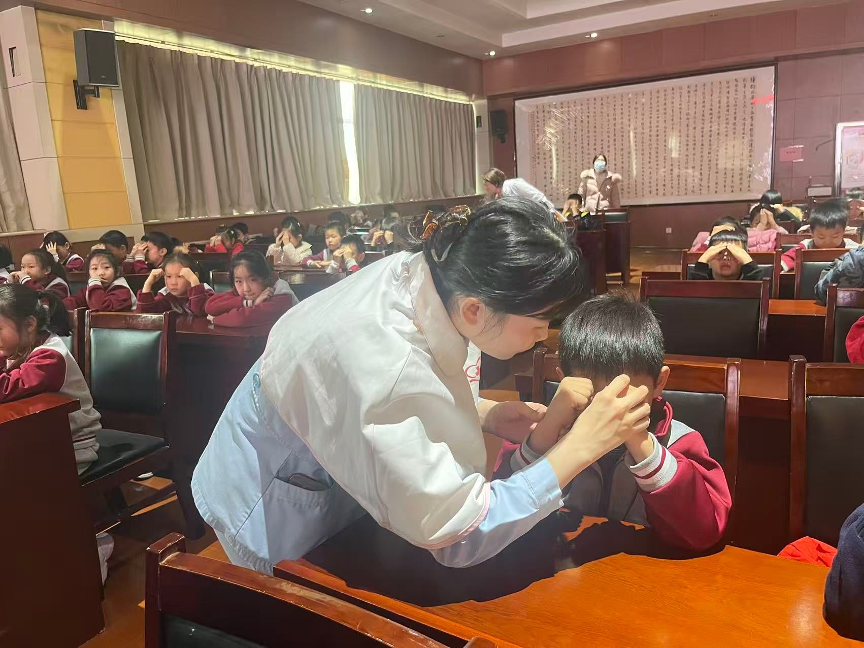 在讲解环节,宿艳主任着重强调了预防近视的重点。她提醒同学们,保持正确的读写姿势至关重要,同时要严格控制电子产品的使用时长。此外,她还鼓励大家积极参与户外运动,让眼睛在自然环境中得到充分放松和休息。为了让同学们更直观、准确地掌握护眼方法,宿艳主任现场亲自示范眼保健操的操作要领,详细讲解每个动作对应的作用和效果。志愿者配合指导同学们如何找准穴位、控制力度和节奏,并督促大家养成每日坚持做眼保健操的良好习惯,以此有效预防近视的发生。