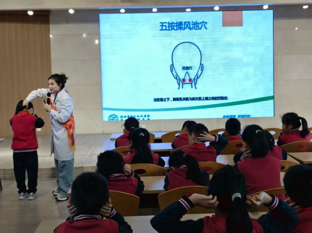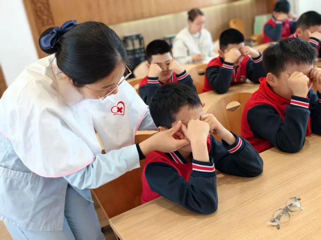 随后,活动进入互动环节,眼十科(中医眼科)主治医师吴婷婷走上讲台,为同学们带来了一堂生动的眼保健操实训课。吴医生用通俗易懂的语言,详细拆解了眼保健操的每一个步骤,重点讲解了眼保健操关键穴位的准确位置及按摩手法。为了让孩子们真正掌握要领,吴医生和两名志愿者走下讲台,来到学生中间进行“一对一”指导。她们耐心地纠正个别同学不规范的手势和力度,手把手地带着大家感受穴位的酸胀感。在专家的悉心带领下,全场学生动作整齐划一,教室里洋溢着浓厚的爱眼氛围。