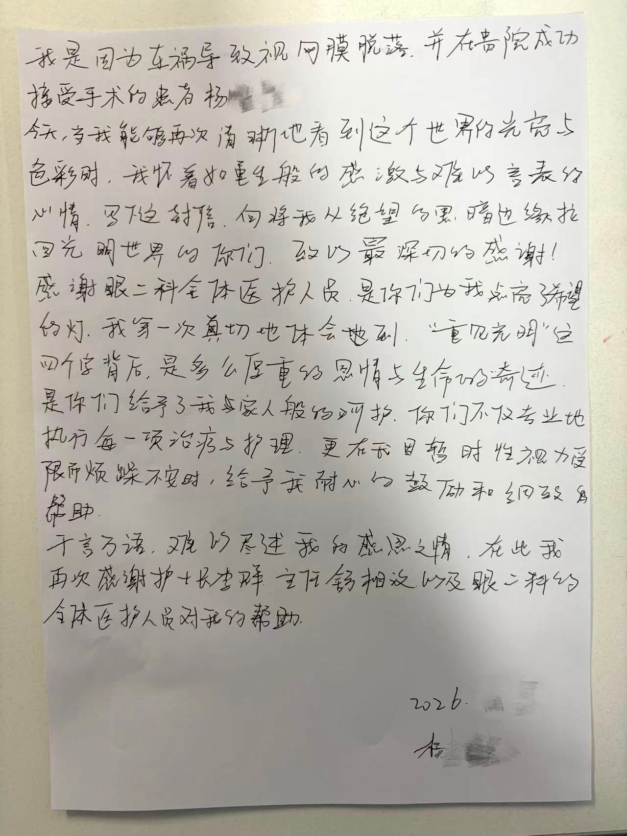 随着视力的逐渐恢复,杨大爷一家人紧皱的眉头渐渐舒展开来。临出院前,他亲笔写下表扬信,感谢眼底病专业全体医护人员的精湛医术和悉心照料。