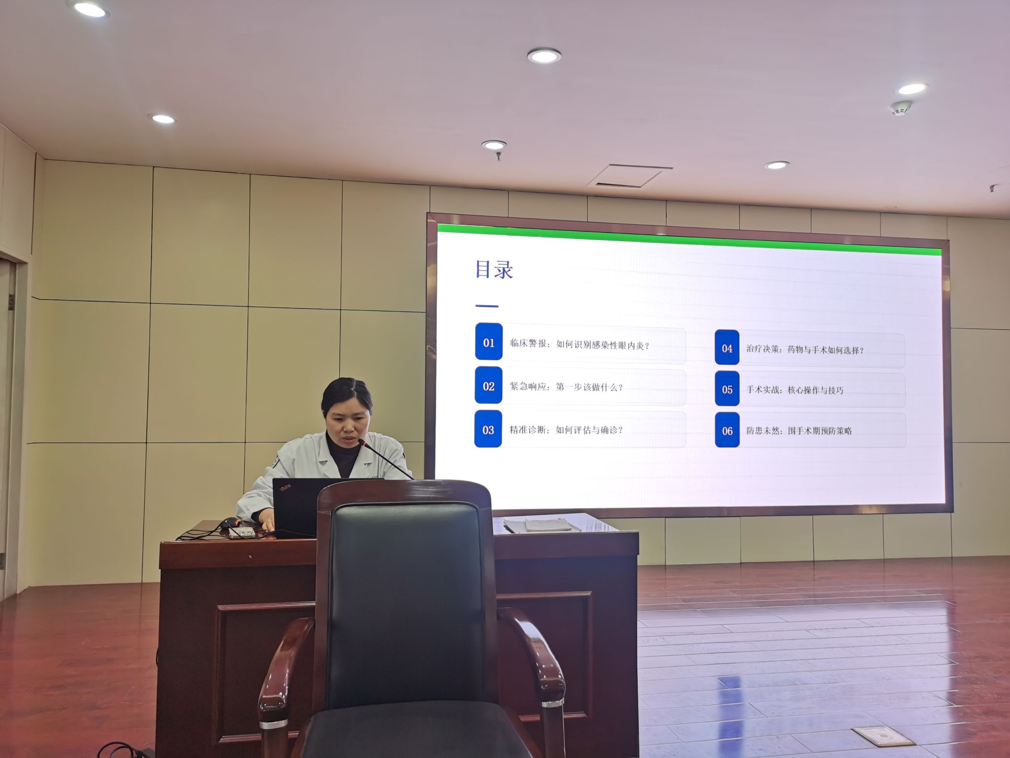 培训中,多位来自临床一线的讲师分别围绕核心内容展开深入授课。针对眼科专科特点,详细解读《眼科手术后感染性眼内炎诊疗专家共识;聚焦器械安全管理,系统讲解器械预处理的各项要求;解读侵入性器械操作相关感染防控制度;立足评审标准,指导各科室建立自查清单,推动感控工作常态化。