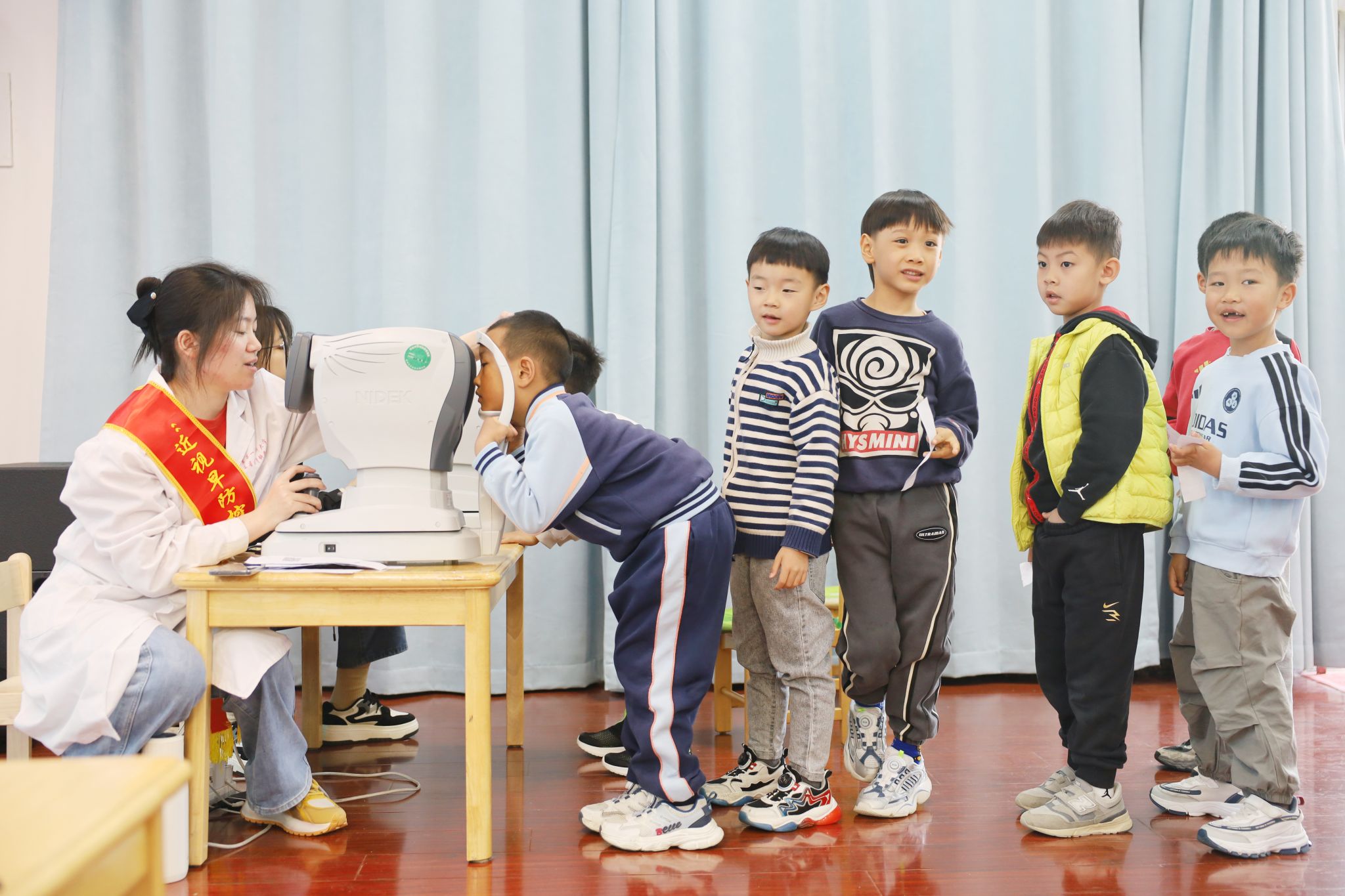 科普教学结束后,眼科志愿者为全园幼儿开展规范化视力筛查与电脑验光,细致检测视力、屈光状态、眼位等关键指标,对筛查中发现的视力异常、屈光不正、斜视弱视倾向等情况逐一记录、现场反馈。同时,为每位孩子建立专属电子眼健康档案,实现筛查数据可追踪、可复查、可管理,为幼儿园与家长持续掌握孩子眼健康动态提供科学依据。