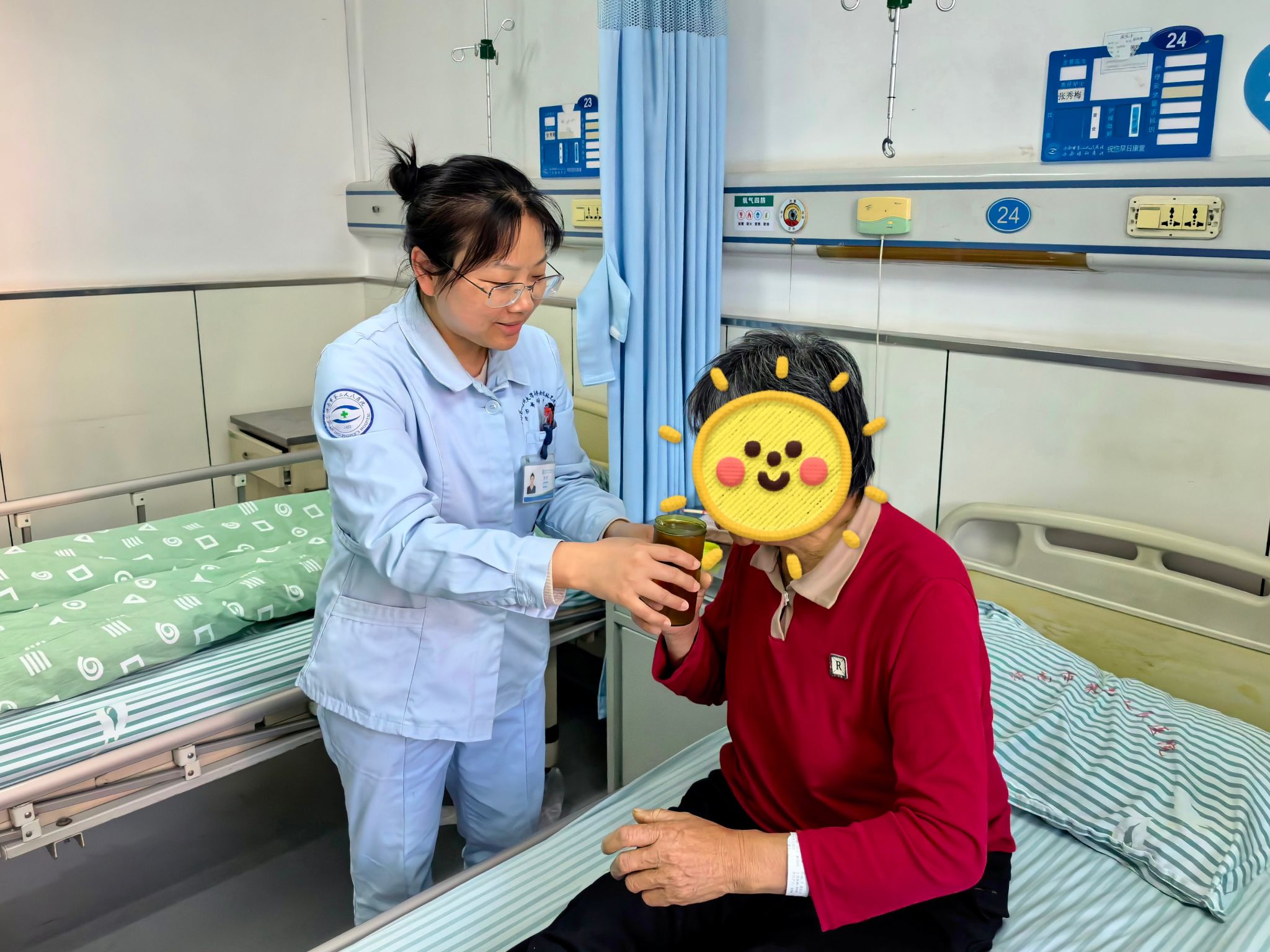 住院期间,眼四科医护团队更是用细节温暖了刘阿姨的心,给予了她无微不至的照料。考虑到刘阿姨年纪较大且离家远,护士们主动帮她打水、热饭,陪她聊天缓解思乡情绪,手术前,医生耐心为刘阿姨讲解手术流程,护士们手把手教她做眼部清洁和注视训练,反复叮嘱注意事项,怕她记不住还特意写了便签, 缓解她的紧张情绪;手术后,护士们定时查房,观察恢复情况,换药时动作轻柔,轻声安抚她的紧张情绪,耐心讲解用药和护理要点,护士们还会细心帮她整理好床头的生活用品。 这份细致入微的关怀,让远离家乡的刘阿姨感受到了家人般的温暖。