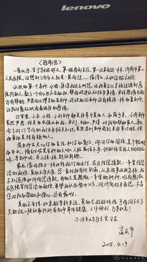 近日,济南市二院影像科收到实习学生的一封感谢信,信中,实习学生充分表达了对在院实习期间影像科全体老师的教导及帮助的感激之情。 据介绍,济南市二院影像科自成为教学科室以来,致力于将学生塑造成... -