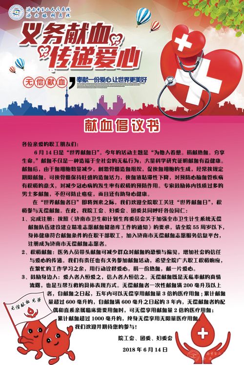6月14日是“世界献血日”。今年献血日的主题是“为他人着想 捐献热血 分享生命。”在“世界献血日”即将到来之际,市二院工会、妇委会、团委向全院职工发出献血倡议,鼓励全院职工关注“世界献血日”,积极参与无偿献... -