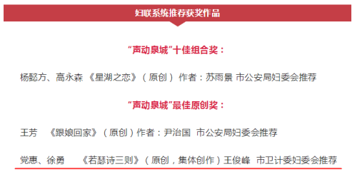 由济南市卫计委妇委会推荐,济南市二院职工王俊峰、于娜创作,徐勇、党惠参加展演的《若瑟诗三则》,在近日市委宣传部、济南广播电视台、市教育局、团市委、市妇联联合主办,济南人民广播电台承办的品牌文化活动“声... -