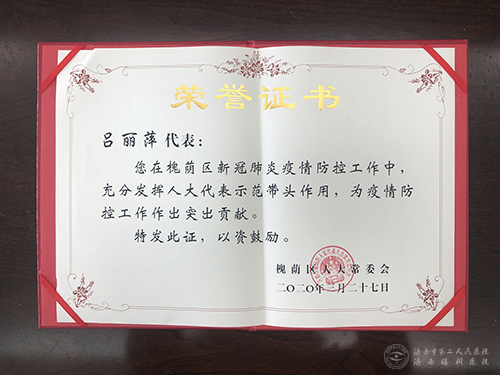 济南市二院党委书记吕丽萍获评“在槐荫区新冠肺炎疫情防控工作中表现突出的人大代表”