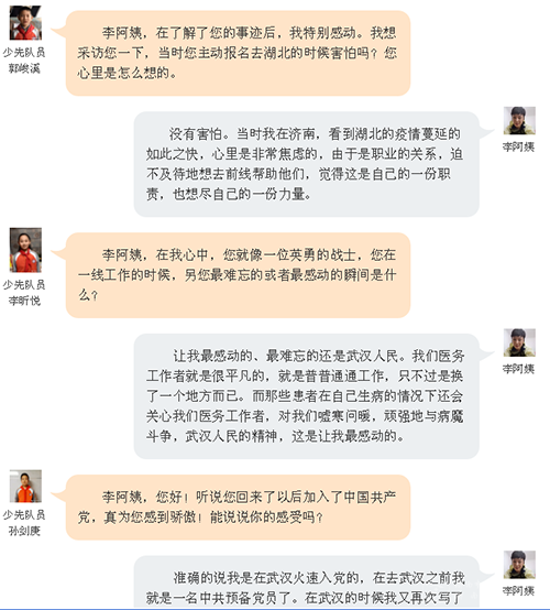 近日,济南市光明街小学“优雅中队”的队员们邀请山东省第四批援鄂医疗队队员、萝莉社 手术室护师李林峻参加了中队“云寻访”活动。抗击新冠肺炎疫情战“疫”打响后,李林峻第一时间向医院递交了“请战书...