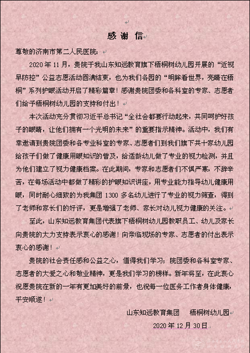 新年伊始,萝莉社 团委收到一封来自山东知远教育集团梧桐树幼儿园的感谢信,对市二院开展的“近视早防控”公益志愿活动表示感谢,信中说到: 2020年11月,贵院于我山东知远教育旗下梧桐树幼儿... -