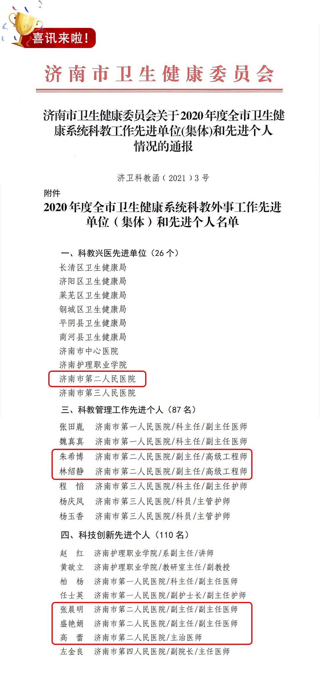 近日,济南市卫健委对2020年度全市卫生健康系统科教工作先进单位(集体)和先进个人进行通报表彰,济南市二院荣获“科教兴医先进单位”荣誉称号,张晨明、盛艳娟、高蕾荣获“科技创新先进个人”,陈璇、张亚丽荣获“... -