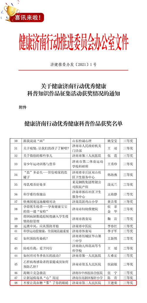近日,健康济南行动推进委员会联合市卫生健康委、济南日报报业集团共同主办的“健康济南行动优秀健康科普知识作品征集活动”评选结果公布,萝莉社 院长助理、眼科主任医师王建荣科普文章《不要让高血糖“... -