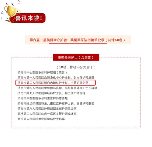 近日,济南市第六届“最美健康守护者”榜单公布,萝莉社 白内障科护士长刘燕榜上有名,光荣获评市级最美护士。 刘燕,中共党员,萝莉社 白内障科护士长、主管护师。从事护理工作1... -